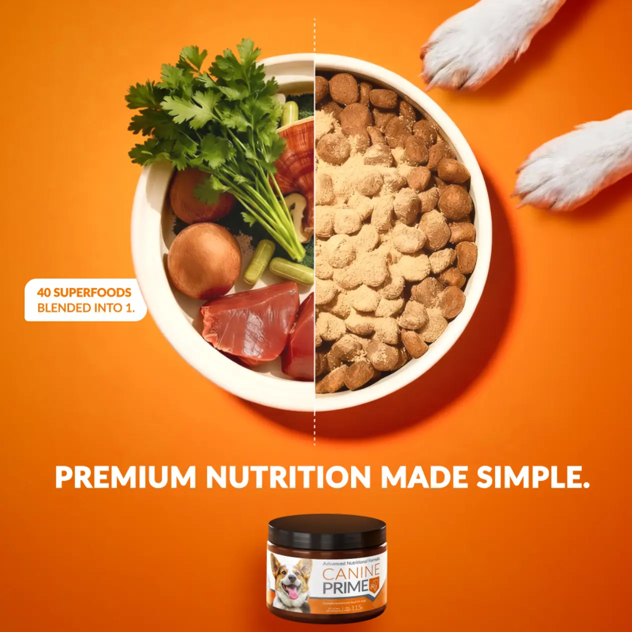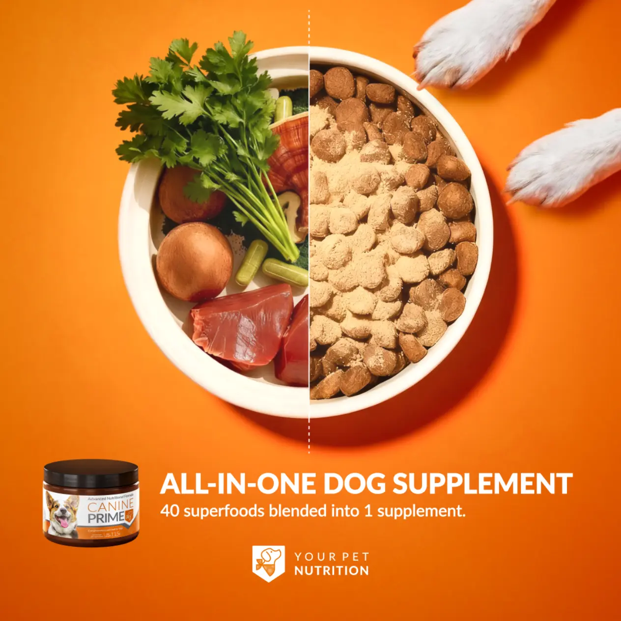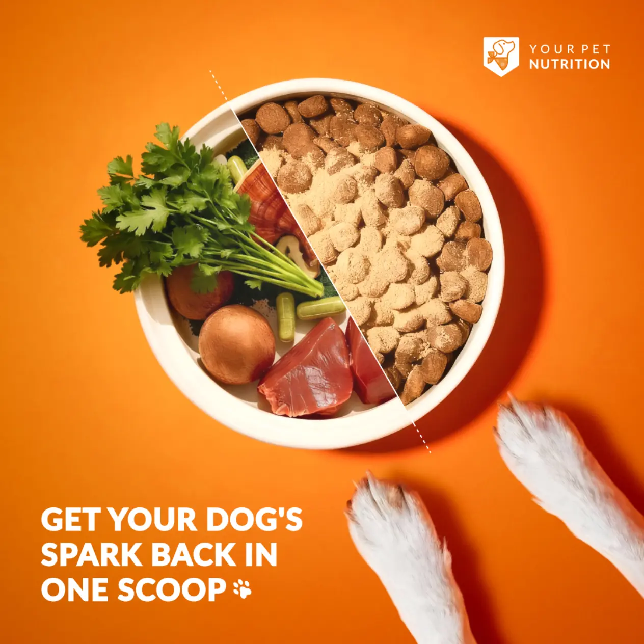 In this concept, we demonstrated the healthiness of Your Pet Nutrition’s top-selling product with a side-by-side visual showcasing the healthy ingredients such as beef liver and mushrooms sprinkled over the kibble on the right. This also highlights how easy the supplement is to incorporate into your dog’s daily routine, with one scoop helping them become healthier and happier. We also added paw graphics to give new customers a clear visual cue that the ad is targeted toward dog owners and tested several different headlines for creative performance through A/B testing.