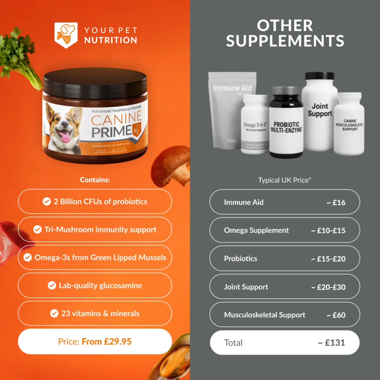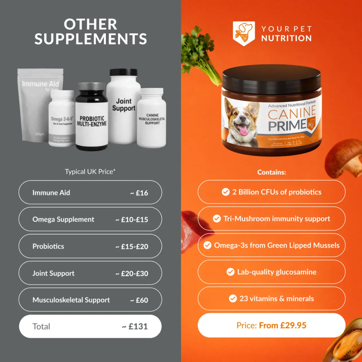 In this creative, we're demonstrating how Your Pet Nutrition’s all-in-one formula for dogs is far cheaper and simpler than buying several separate products that achieve the same results. You get all the benefits of other single-purpose dog supplements combined into one cost-effective formula.
