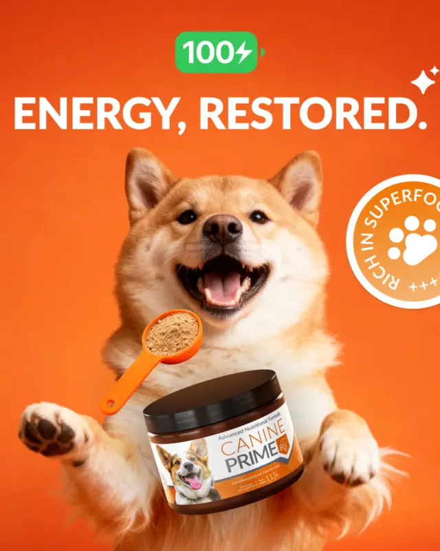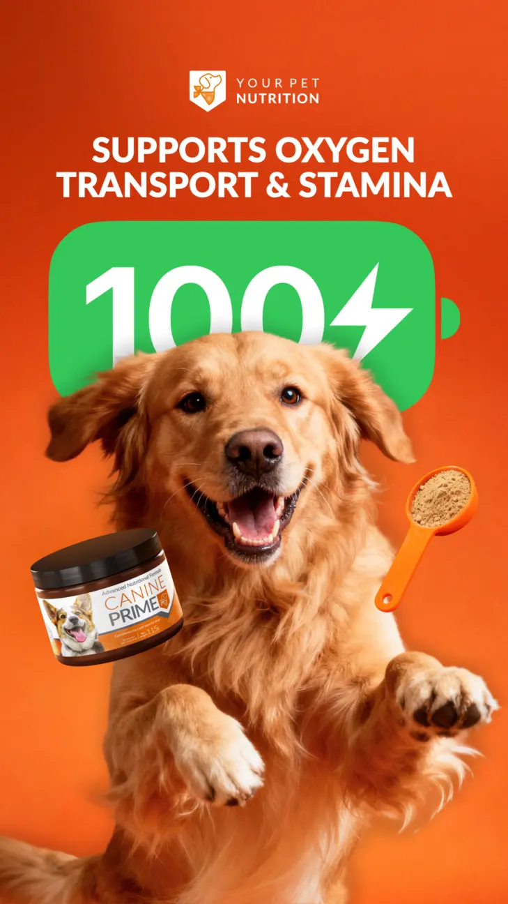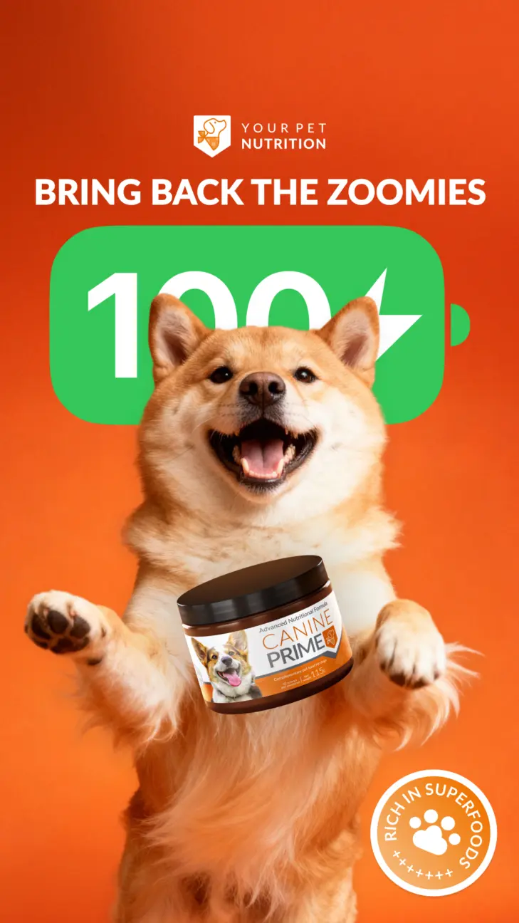 In this creative, we wanted to communicate the concept of a dog being at 100% charge after taking this pet food supplement. A major problem that your pet nutrition brand solves is helping older dogs feel better and more energetic after taking their supplement.