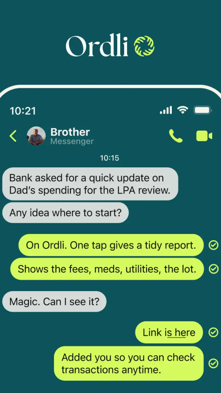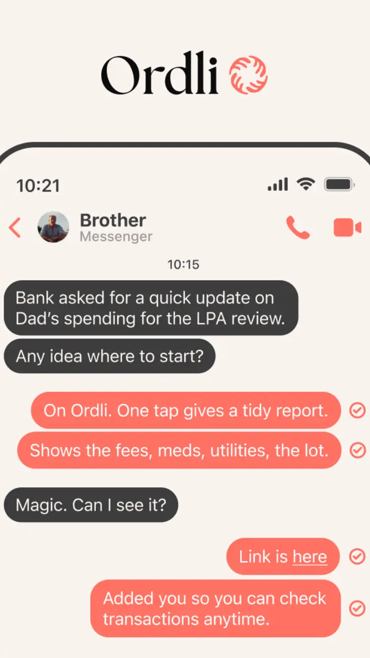 In both, the conversation quickly communicates the value proposition: someone needs to report on their dad’s spending for a legal or care-related reason, which a lot of people with elderly parents can resonate with, and the solution comes effortlessly: “On Ordli. One tap gives a tidy report.”