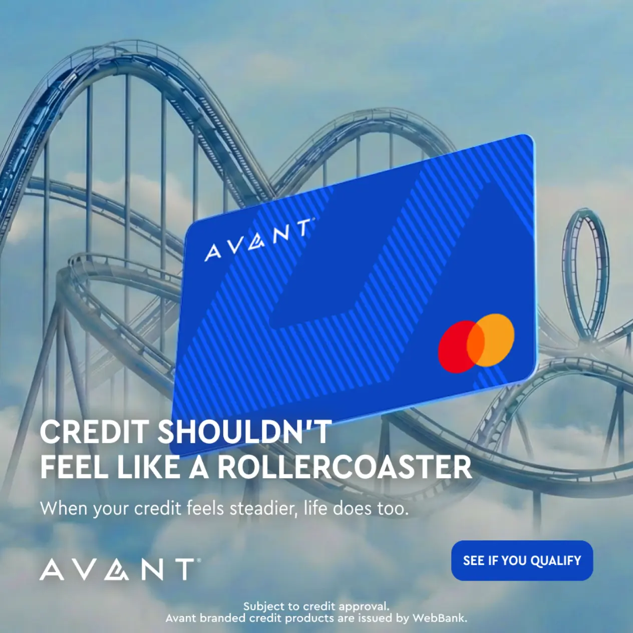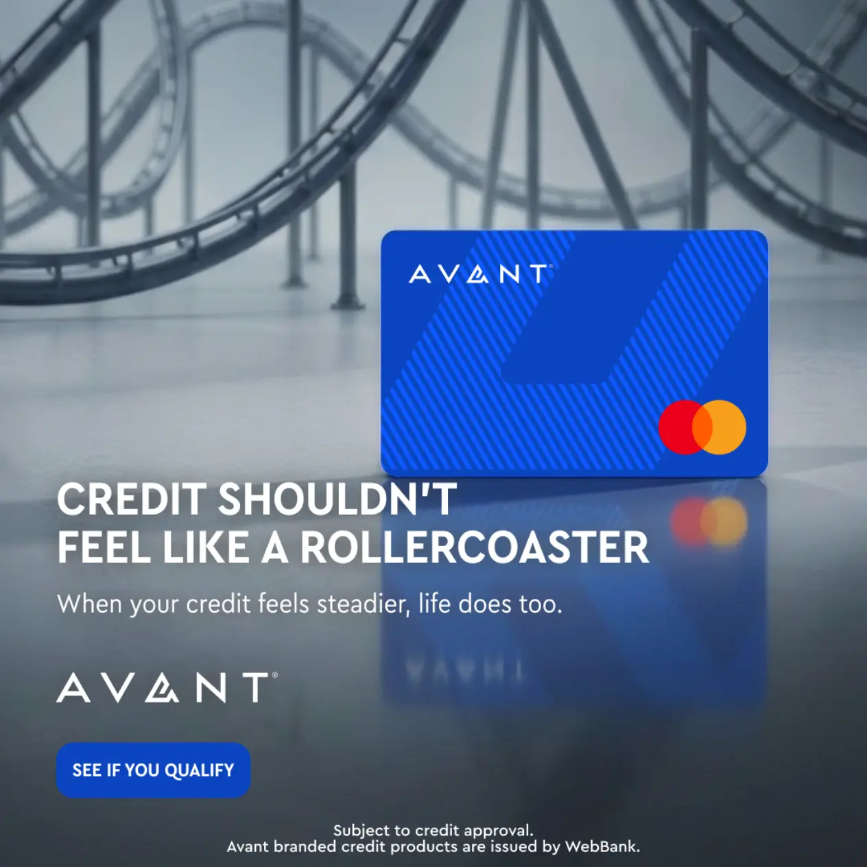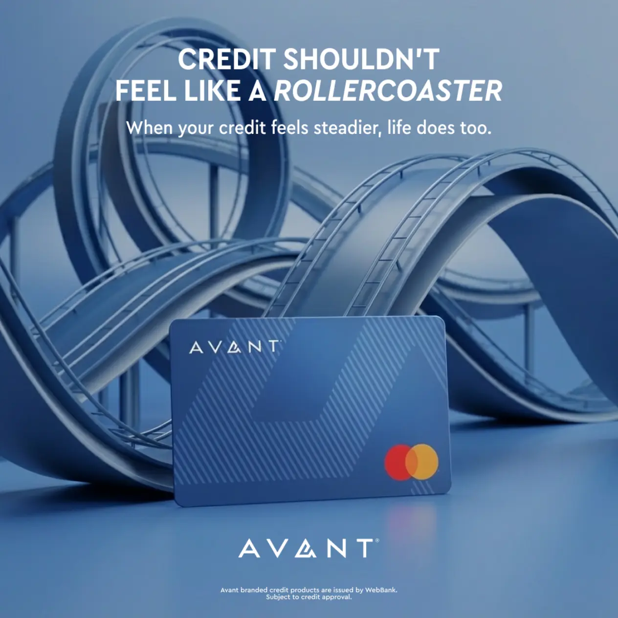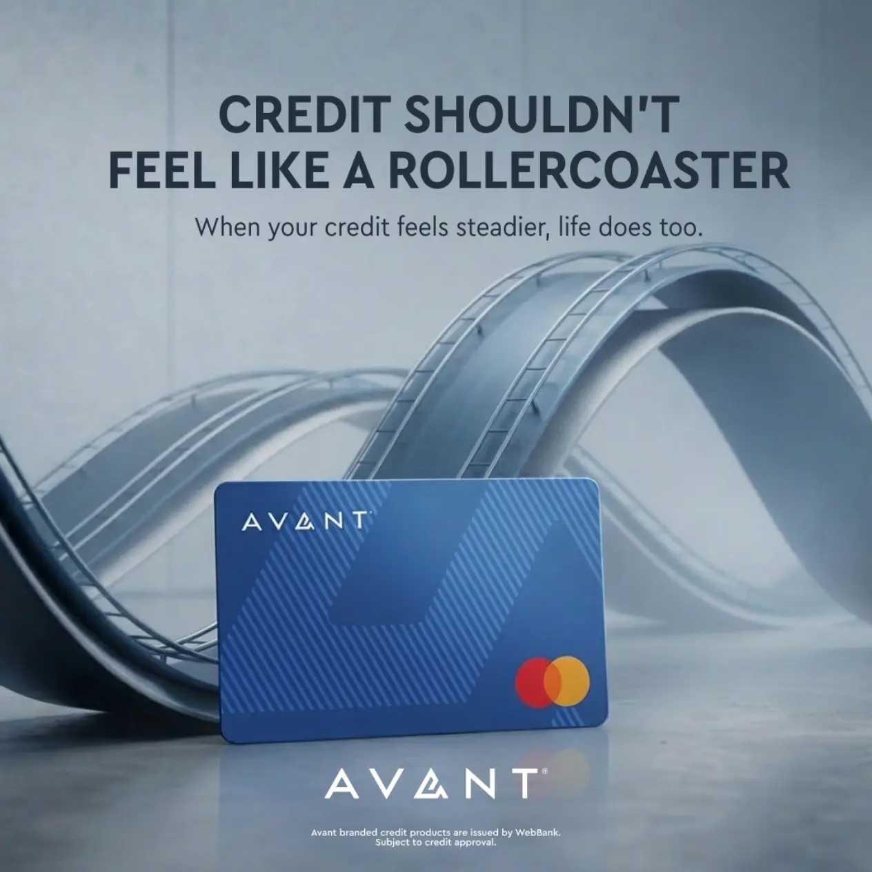 The core idea was simple: building your credit shouldn't feel like a rollercoaster. We brought this financial tension to life through a bold, metaphorical visual. It communicates the visceral feeling of financial instability at a glance, before anchoring the user with a hero product shot and a clear, steadying resolution: "When your credit feels steadier, life does too."