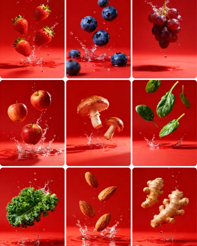 Using highly detailed prompts, we generated photorealistic scenes of individual ingredients captured mid-motion as they splash into water against a vibrant red studio backdrop. Each image was crafted to resemble a professionally shot product photograph, with careful attention to lighting, composition and texture to ensure consistency across the set.